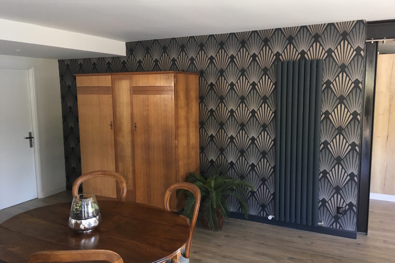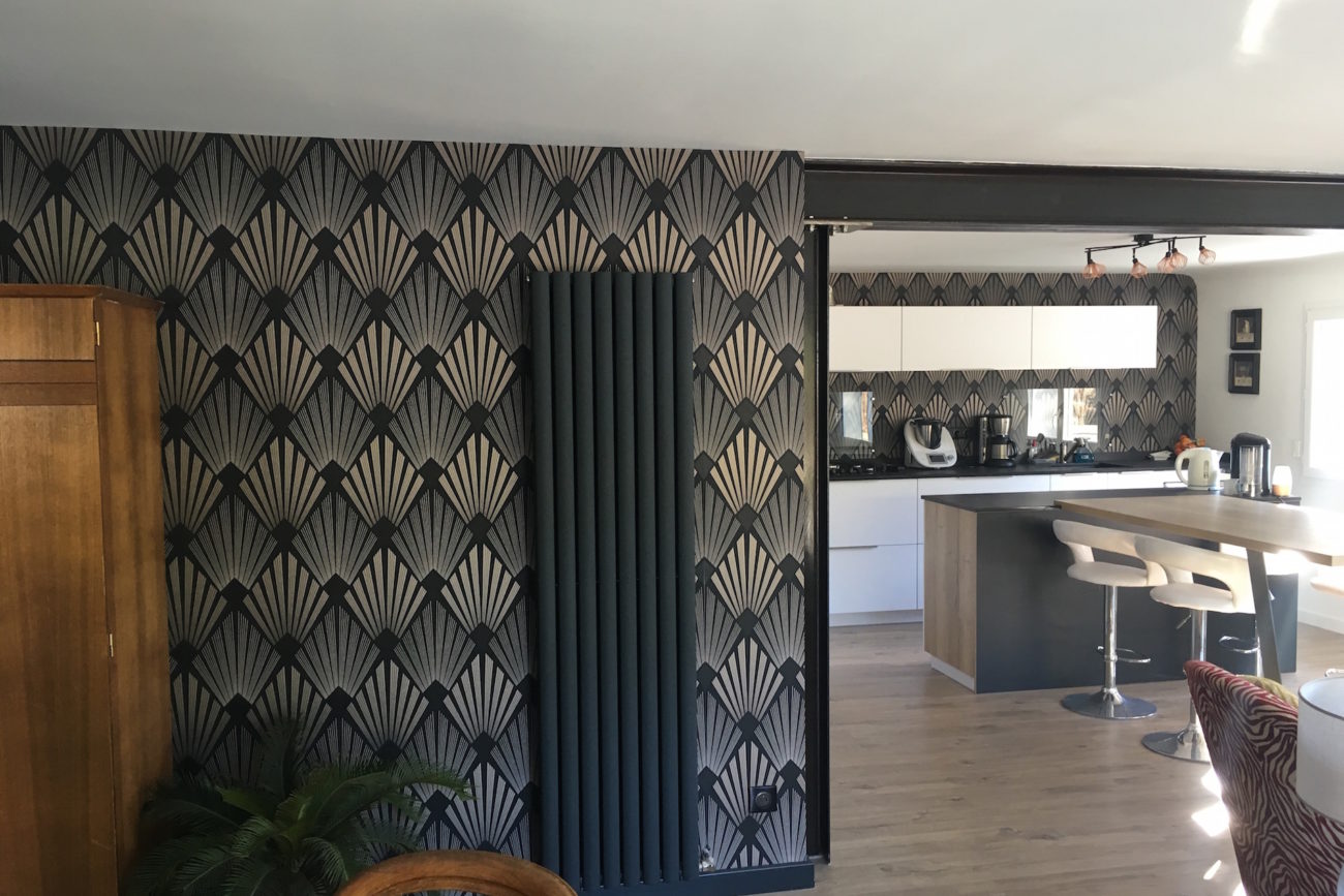 Le client souhaitait une tapisserie à motif. Nous avons donc procéder à une pose minutieuse pour garantir un raccordement parfait et invisible entre chaque morceaux.